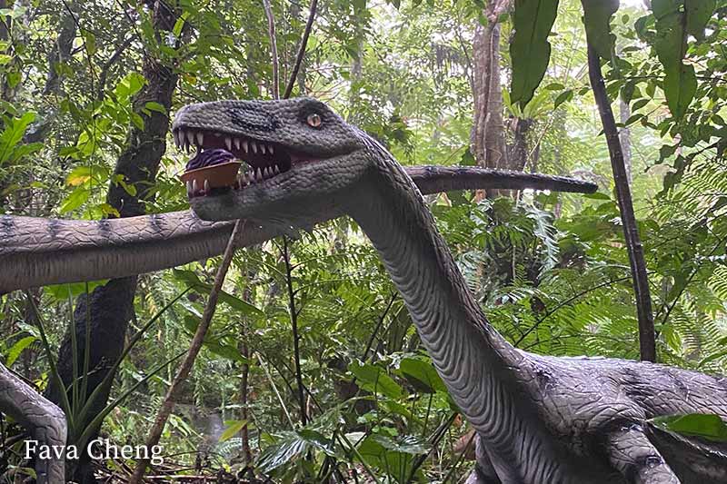 早上在民宿吃過早餐後便直接開車前往名護市的恐龍主題公園「DINO恐龍PARK 山原亞熱帶森林」,車程約1小時,是特地為喜愛恐龍的外甥仔安排的行程。公園其實是沖繩元祖紫薯撻品牌「御菓子御殿」名護店的一部分,在2016年時進行改裝,於原有的山原亞熱帶森林增置多個恐龍模型,以「DINO恐龍PARK」重新開幕。